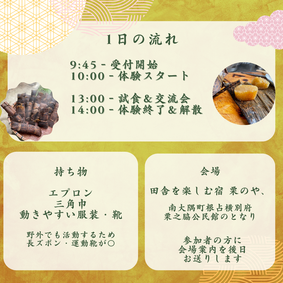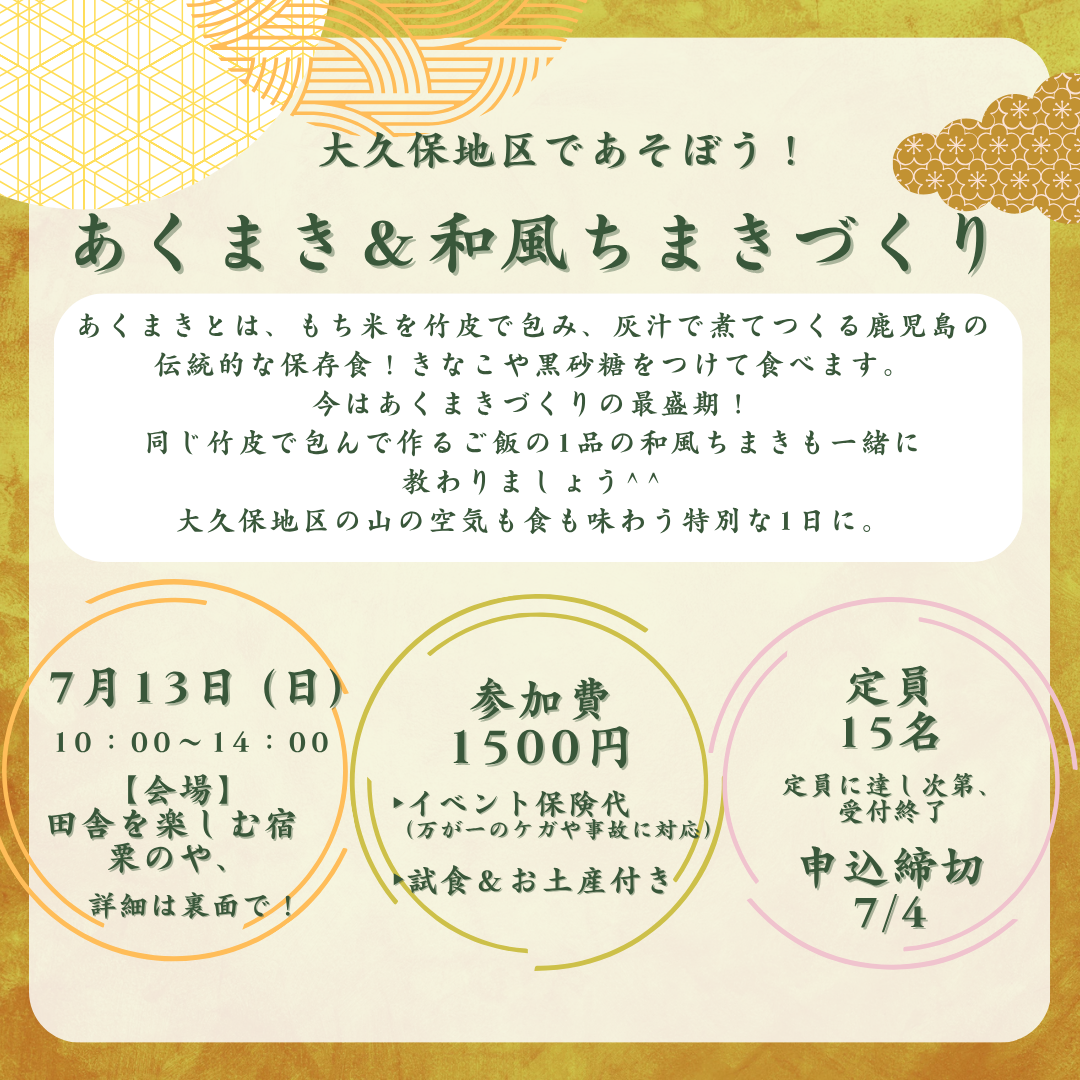今回は、長年にわたってあくまきを製造・販売してきたプロフェッショナルである大久保幾美(おおくぼ・いくみ)さんを講師としてお迎えし、秘伝の作り方をレクチャーしていただきます!