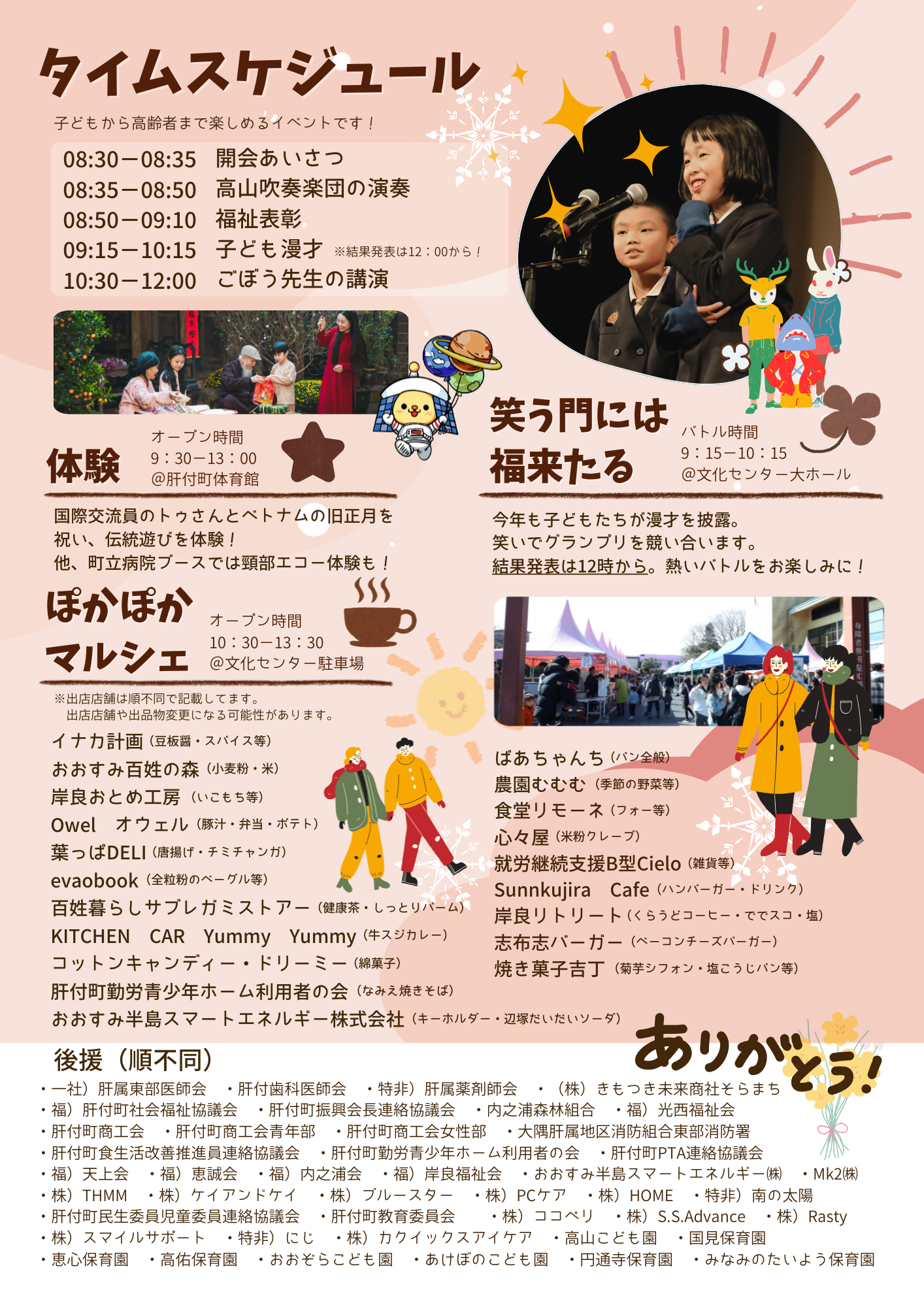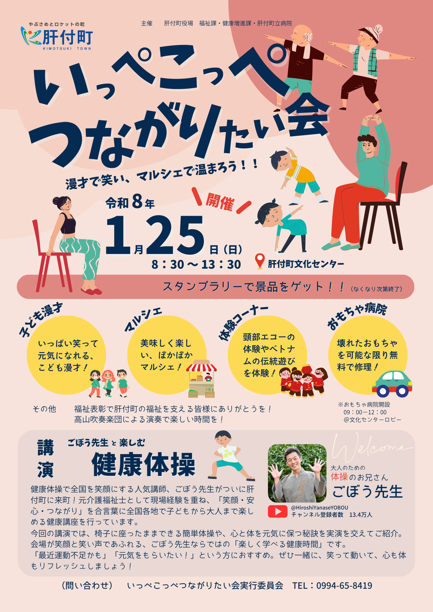 今年もいっぺこっぺつながり大会が開催されます。今回の特別公演は大人のための体操のお兄さんのごぼう先生をお迎えして、椅子に座ったままできる簡単体操や心と体を元気に保つ秘訣を実演を交えて紹介。その他にも「ぽかぽかマルシェ」「笑う門には福きたる」「体験ブース」などイベントが盛りだくさん。
