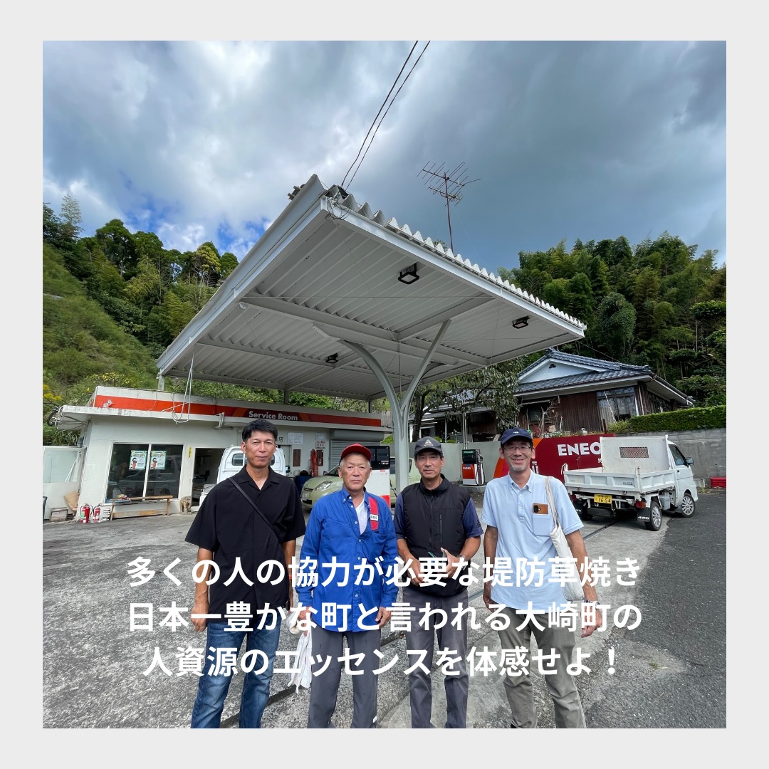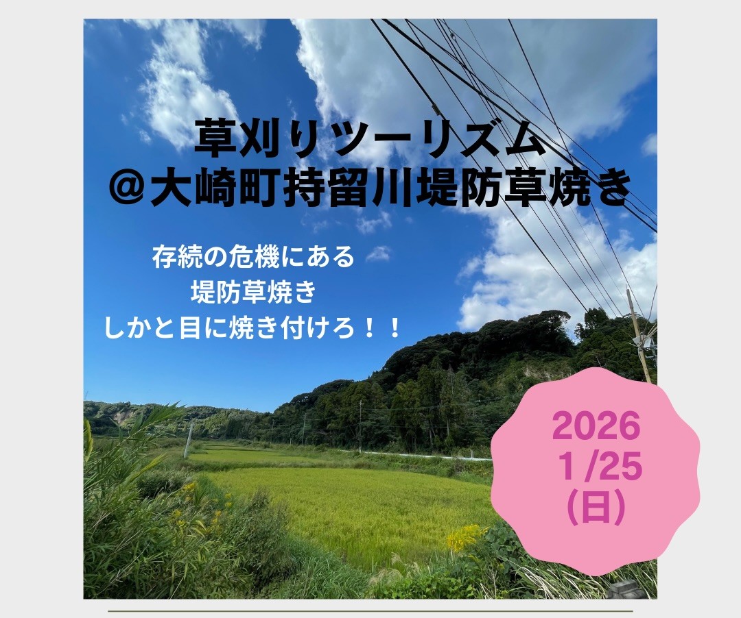 舞台は、大崎町・持留川の堤防。堤防の草刈りに加え、昔から続く堤防草焼きも同時に行います。