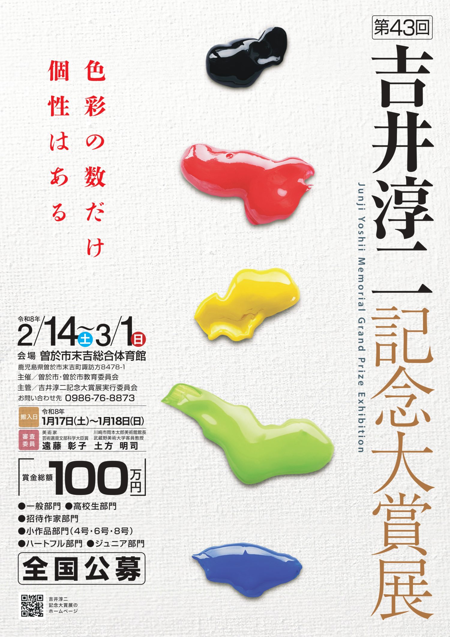 吉井淳二記念大賞展とは、芸術文化の振興を図るため、文化勲章受章者であり日本芸術院会員であった故吉井淳二画伯の功績を讃え、併せて新進作家の台頭を促すために曽於市が「絵のまちづくり」運動の一環として毎年開催している記念展となっております。