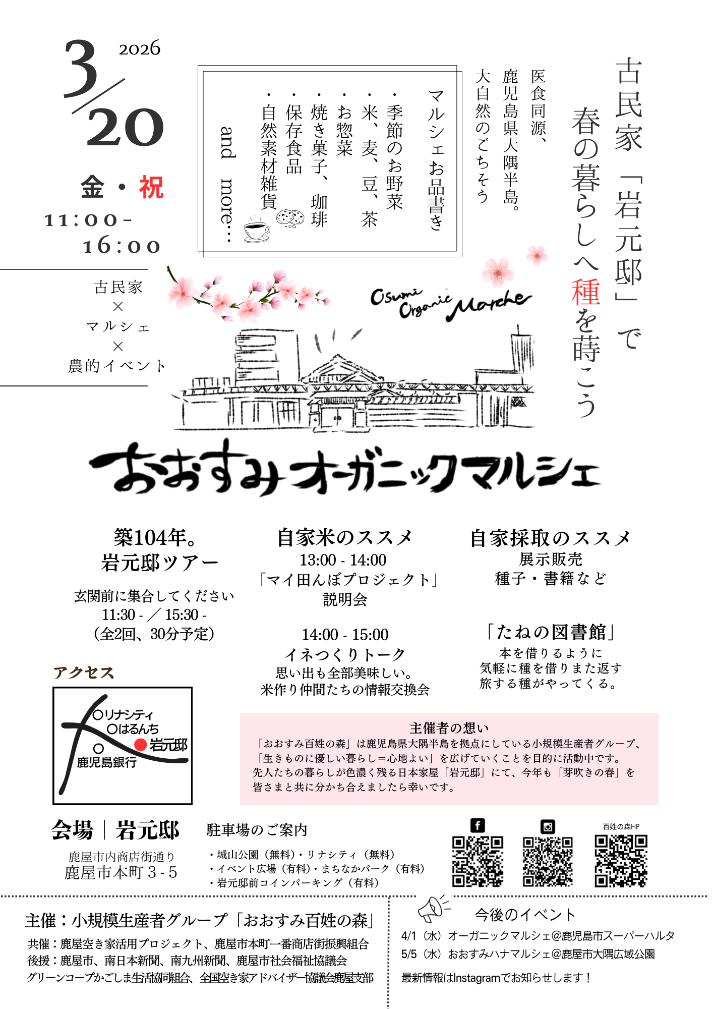 約10店舗のマルシェ販売のほか、岩元邸ツアー、自家米のススメ、イネつくりトーク、タネの図書館などのイベントを開催します。