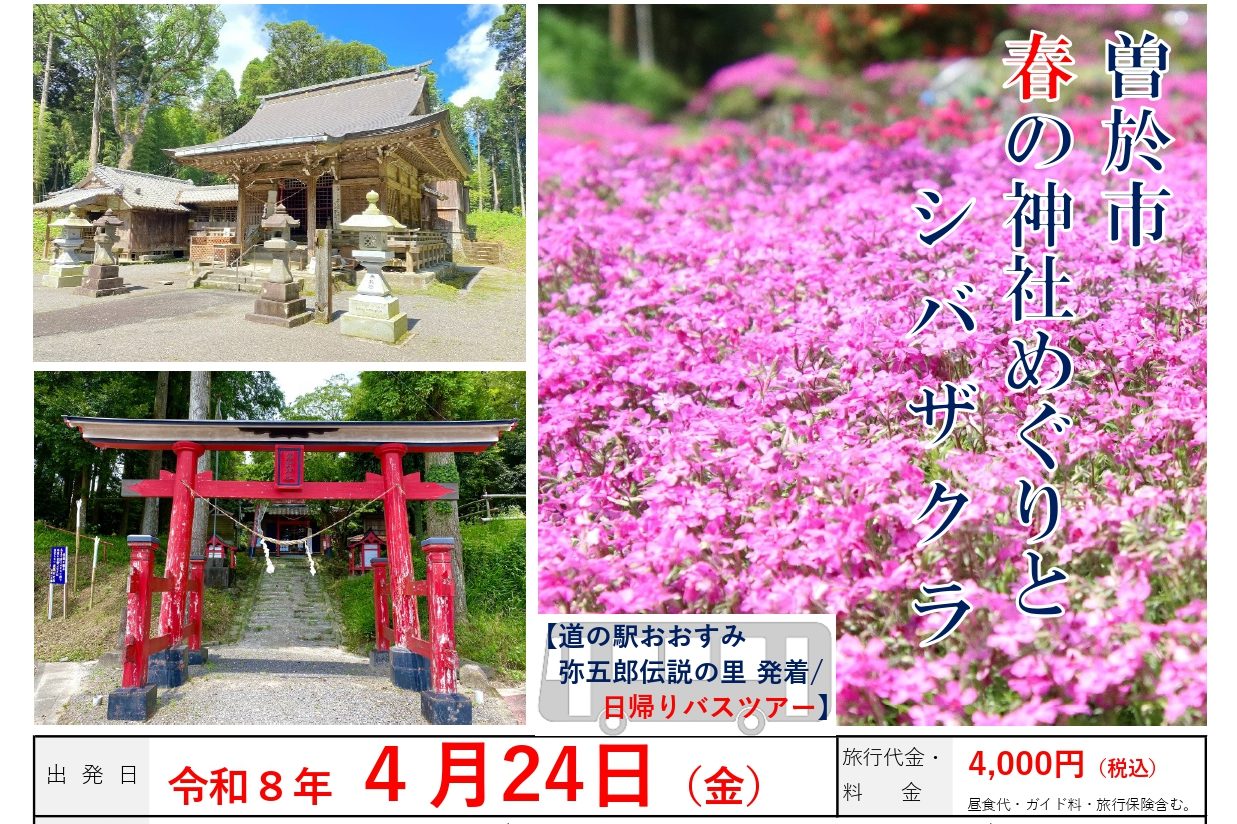 観光ガイドの案内のもと,大隅町の「岩川八幡神社」,末吉町の「檍神社」・「熊野神社」,財部町の「日光神社」と由緒ある市内の4社をめぐります。そして,大隅町の南州園茶舗(なんしゅうえんちゃほ)では,一面色鮮やかに咲き誇る「シバザクラ」をご鑑賞いただきます。