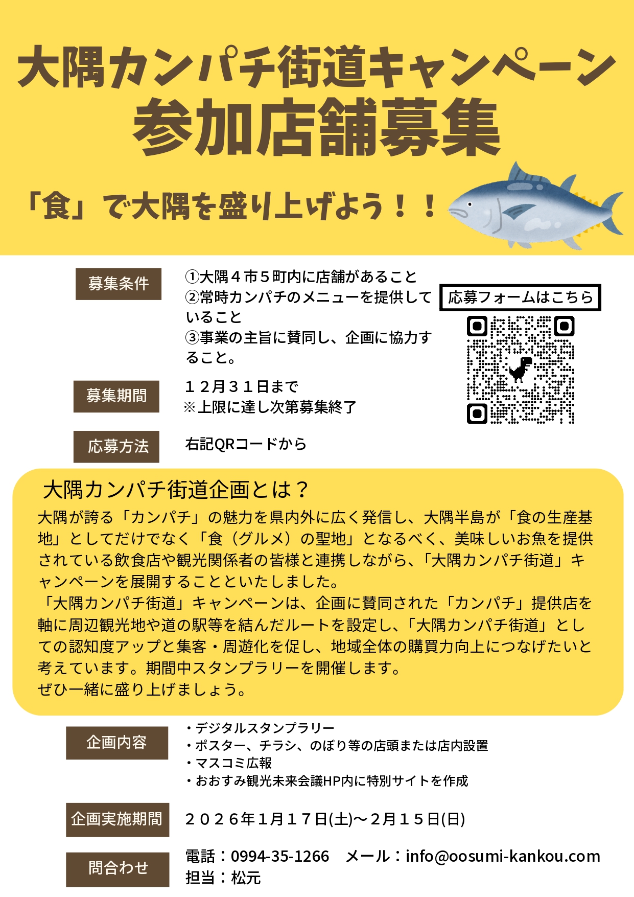 この度(株)おおすみ観光未来会議では大隅が誇る「カンパチ」の魅力を県内外に広く発信し、大隅半島が「食の生産基地」としてだけでなく「食(グルメ)の聖地」となるべく、美味しいお魚を提供されている飲食店や観光関係者の皆様と連携しながら、「大隅カンパチ街道」キャンペーンを展開することといたしました。