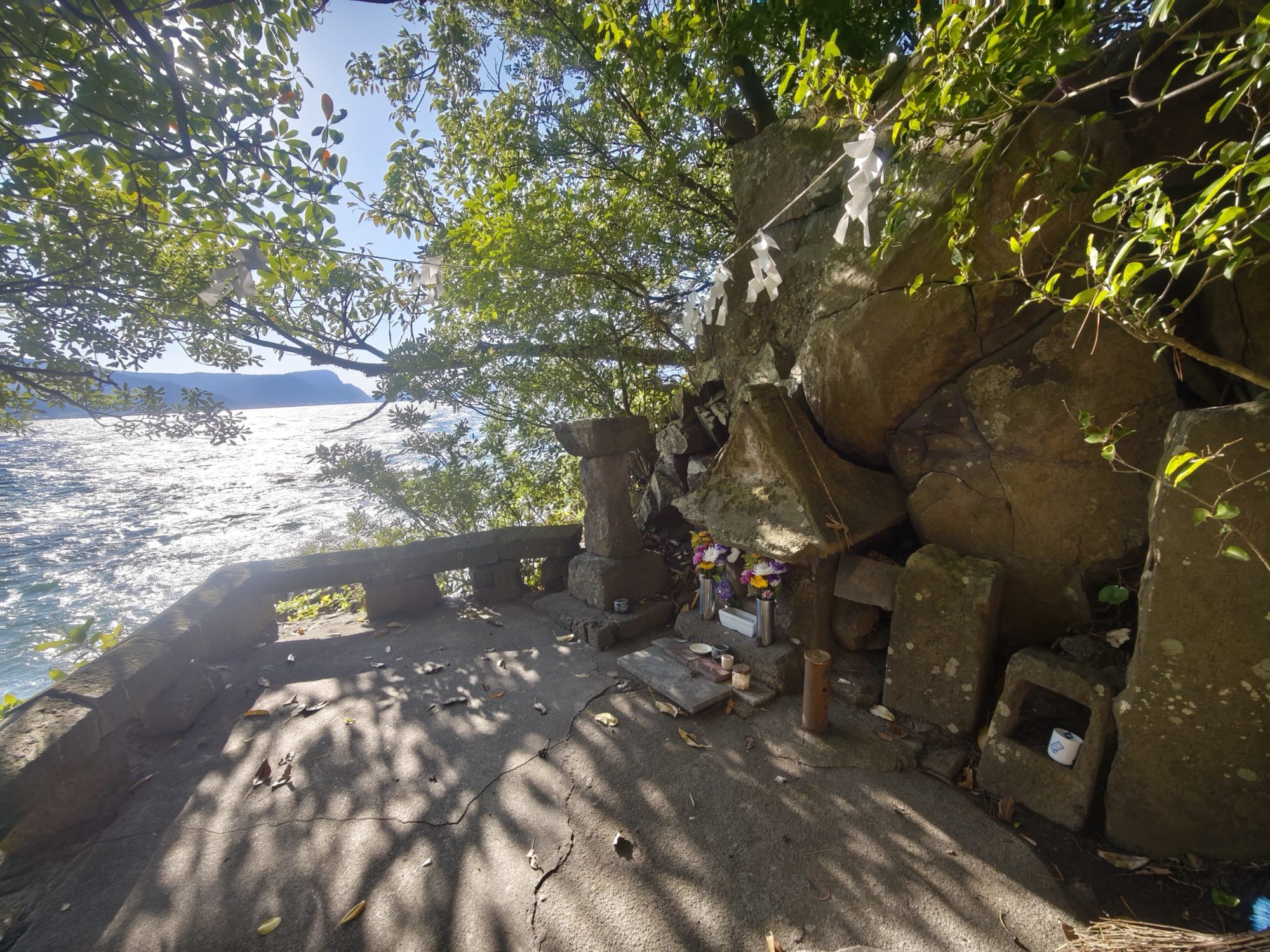 階段を降りると波打ち際のすぐ近くに小さな石祠があります。