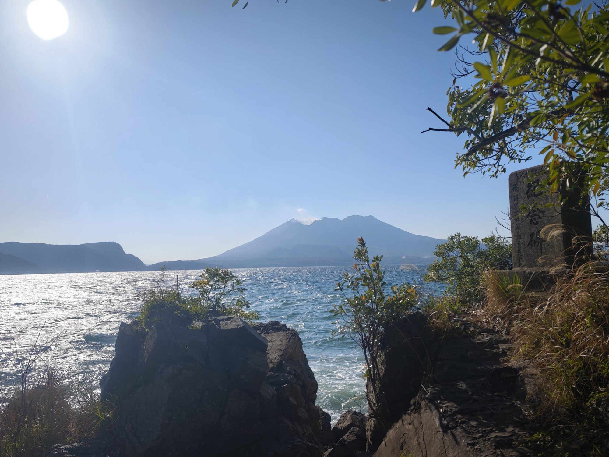 祠を包むように伸びた木の枝越しに、錦江湾と桜島を眺めることができます。