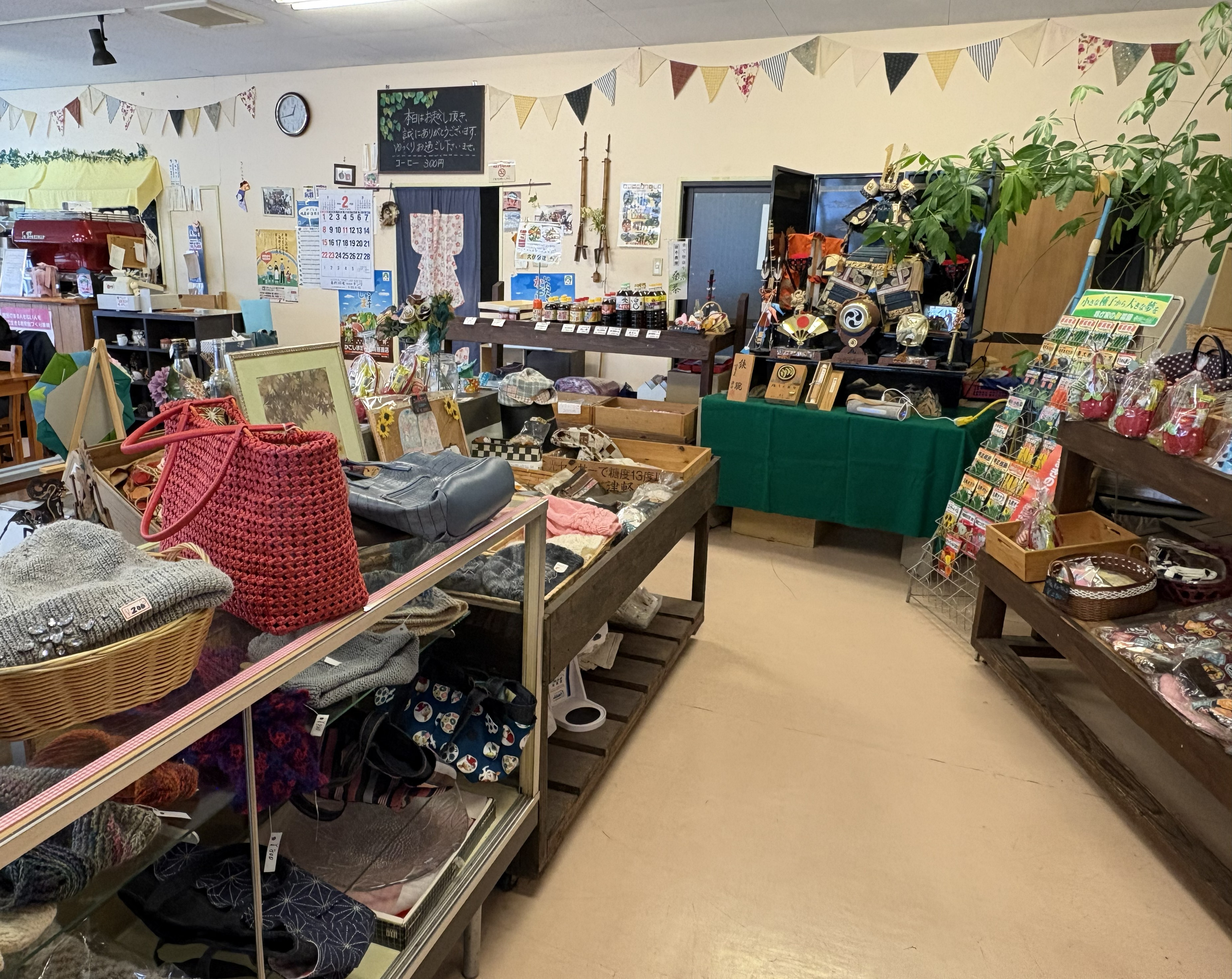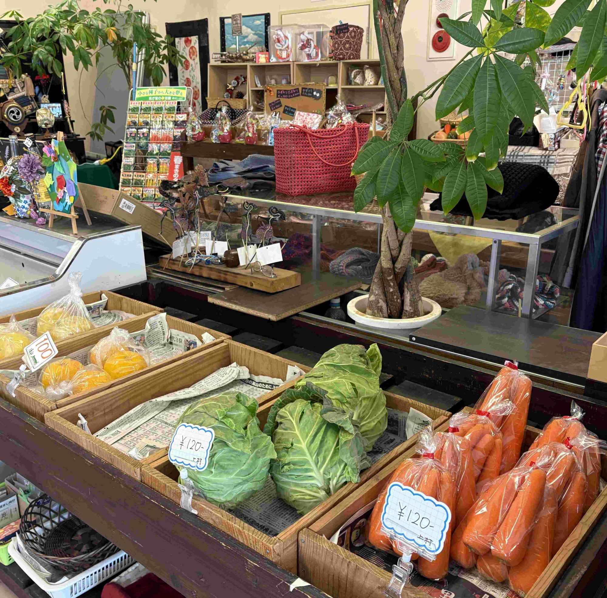 直売コーナー:地元の方が持ち込む新鮮な野菜や、手作り雑貨が並びます。